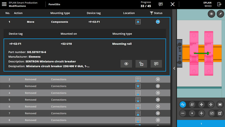 EPLAN Smart Production is een hulpsysteem voor werknemers in de paneelbouw. Met behulp van checklists worden werknemers door de installatie van afzonderlijke componenten en de bedrading van schakelkasten geleid. Het systeem levert de benodigde informatie voor elke werkstap. Een 3D-model van de schakelkast geeft een nog beter inzicht in welke actie op dat moment nodig is.